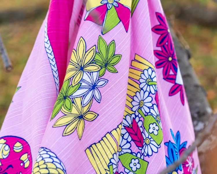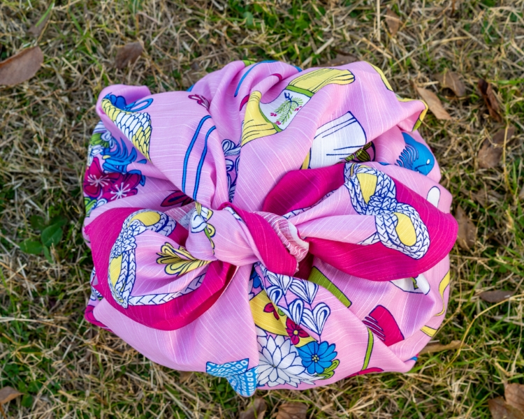 舞妓さんの化粧箱をひっくり返したような、レトロで愛らしい小物たち。包み方次第で変わる表情を楽しめる一枚です。