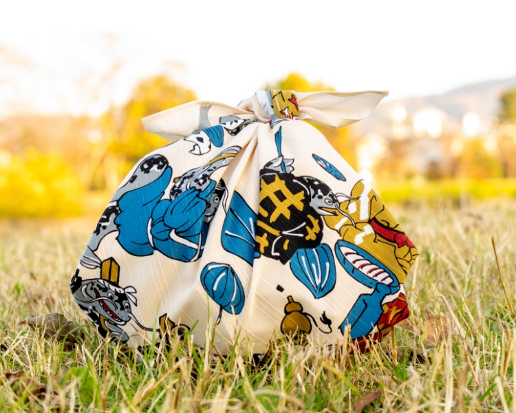 個性豊かなナマズたちが祭りに興じる、コミカルで懐かしい風呂敷。隠れキャラを探す遊び心も魅力です。