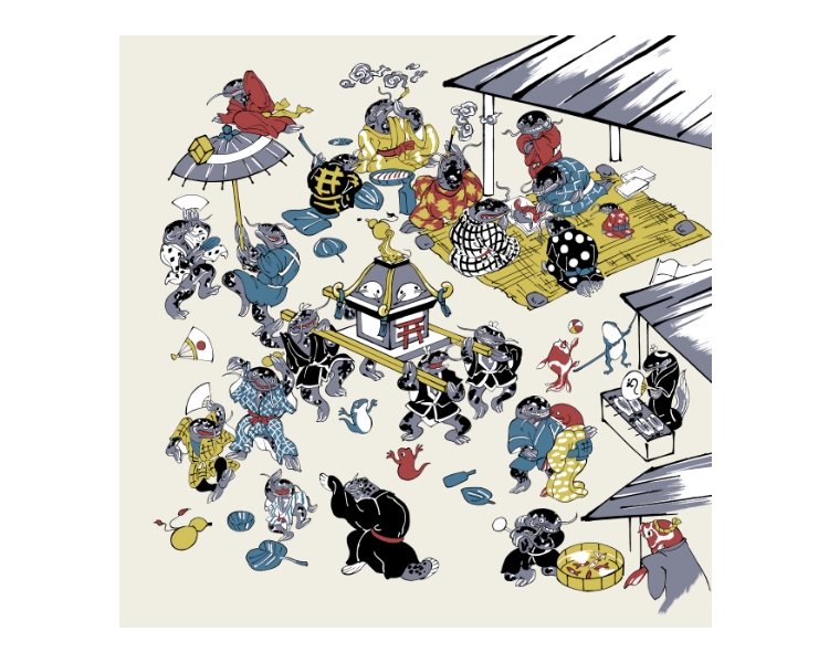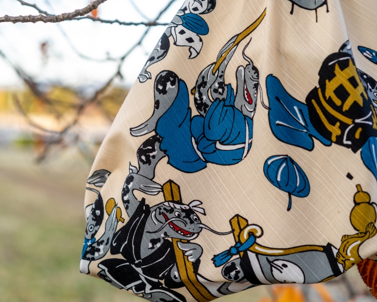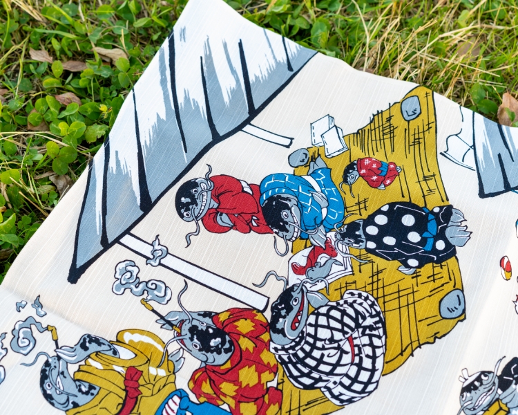 ナマズたちのお祭りの一幕を描いた一風変わったデザイン。神輿を担いだり、出店の遊びに興じたり、コミカルな動きがにぎやかで楽しい風呂敷に仕上がりました。ひとりひとり個性あふれるナマズたちを見ていると古き良き時代の文化や繋がりを思い出させてくれます。ナマズに紛れて別の生き物もいるので探してみるのも一興です。