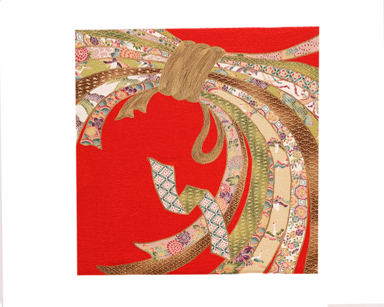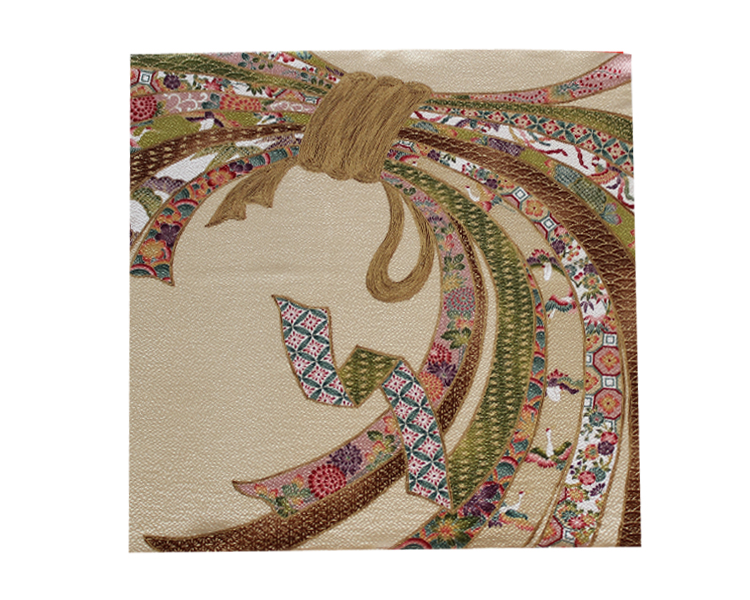 吉祥の飾りといえば熨斗。贈答品に熨斗を添えるのは、送り主の心の清浄と品物の無害を示すシンボルで汚れのないことを表し、さらに長寿を祈るものでありますが、正式には鮑(アワビ)の肉を薄く剥いで乾燥したものを用います。鮑には不老長寿にまつわる伝説も多く、起源は古代中国までさかのぼります。そんな吉祥の飾りとして代表的な熨斗を文様化しました。