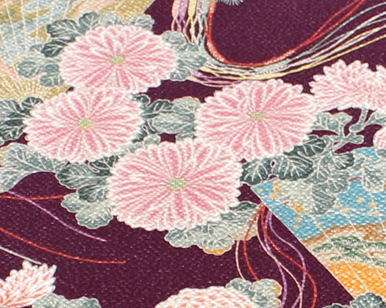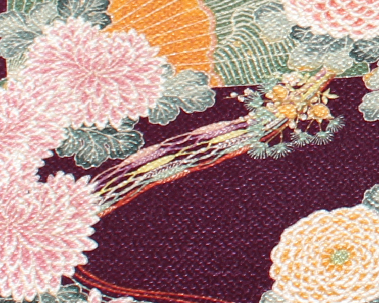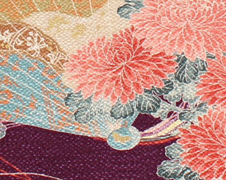 檜扇とは、檜の薄板の上部を絹糸でとじた扇です。平安時代の貴族が装身具として使いました。美しい彩色で雲取や絵を描いて、飾り結びを付け、その紐を長くたらすなど、華麗をきわめました。紐の流れが典雅で慶事の染織品に相応しい格調と美しさがあります。コレクションの小袖(明治時代前期)から柄を取材し、風呂敷の柄として新たにつくりました。