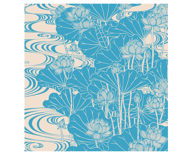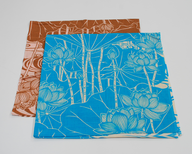 蓮は花と実を共につけて育つ生命力の強さをもつことから豊穣の象徴とされています。神に供える花でもあり、美しい花を咲かせることから、気品ある美しい女性を喩える意味も込められています。どんな包み方をしても蓮の花が見えるように配置しております。伝統的な柄ですが爽やかな色合いに染めており幅広い年齢層の方に人気の風呂敷です。