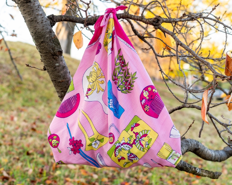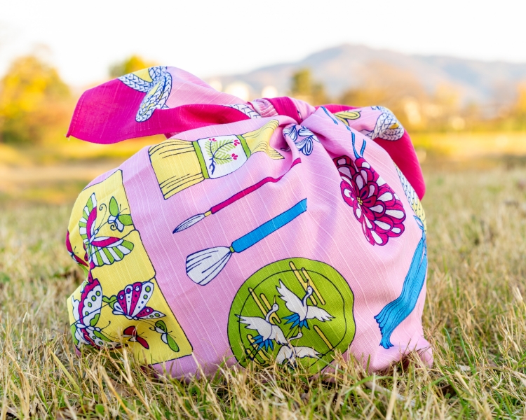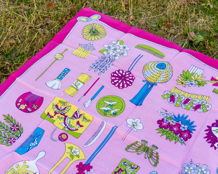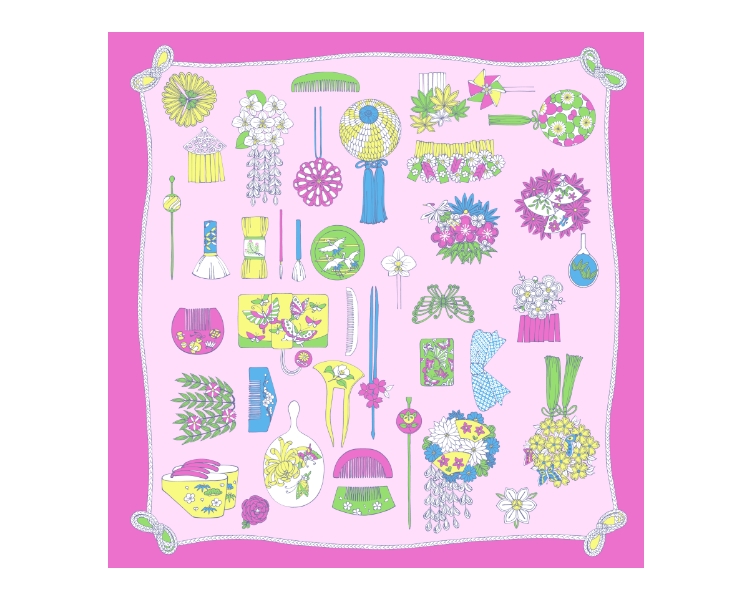 舞妓さんの化粧箱をひっくり返したような、レトロで愛らしい小物たち。包み方次第で変わる表情を楽しめる一枚です。
