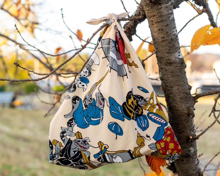 個性豊かなナマズたちが祭りに興じる、コミカルで懐かしい風呂敷。隠れキャラを探す遊び心も魅力です。