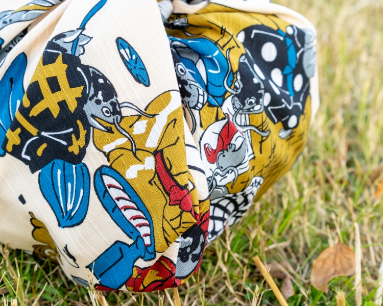 ナマズたちのお祭りの一幕を描いた一風変わったデザイン。神輿を担いだり、出店の遊びに興じたり、コミカルな動きがにぎやかで楽しい風呂敷に仕上がりました。ひとりひとり個性あふれるナマズたちを見ていると古き良き時代の文化や繋がりを思い出させてくれます。ナマズに紛れて別の生き物もいるので探してみるのも一興です。