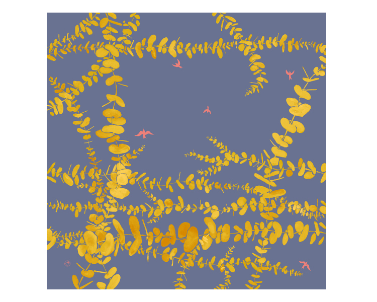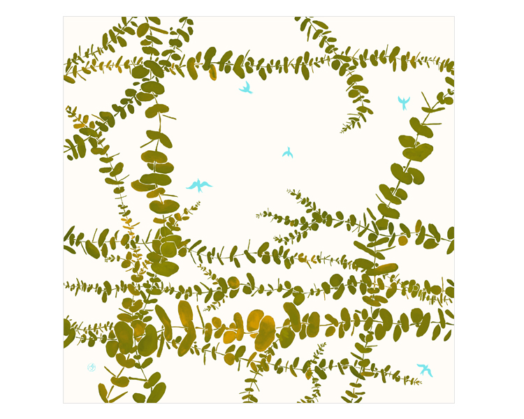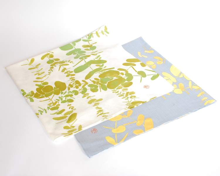 ユーカリは厳しい土地でもよく育って大地を緑で覆ってくれます。そんな力強さを願って柄にしたてました。柔らかな葉っぱの表情を出すため、たくさんの色を使い分けております。ユーカリ柄の柔らかな雰囲気に合わせて風呂敷としてはもちろん、ストールなどにもご利用いただけます。